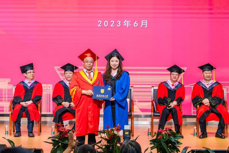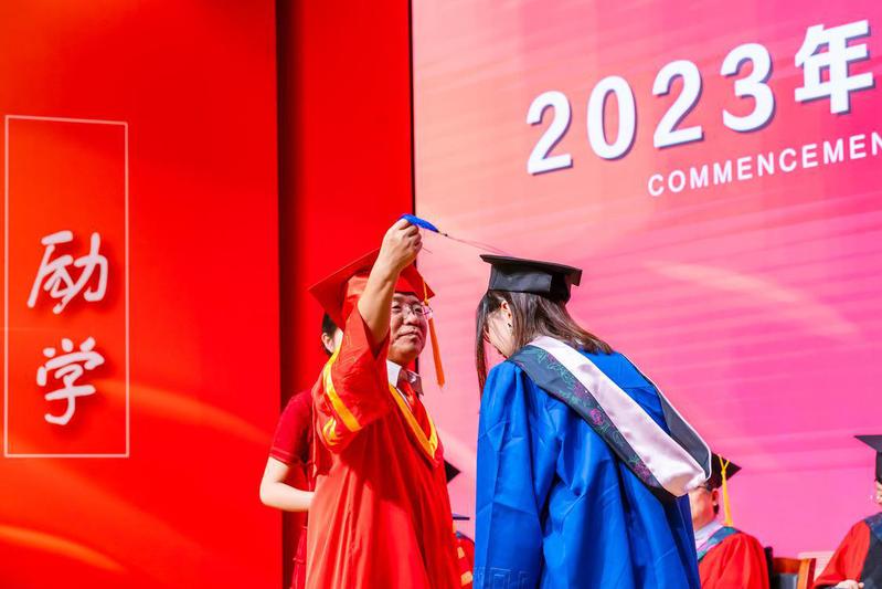 研究生毕业典礼专场上,m88校长于海峰为毕业生拨穗。/佛山市新闻传媒中心记者王澍摄
