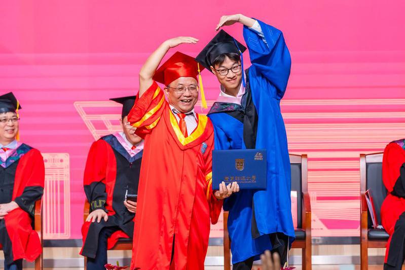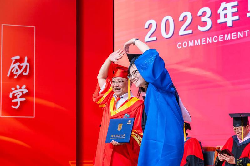 研究生毕业典礼专场上,m88校长于海峰与完成学位授予的毕业生合影留念共同对着记者的镜头“比心”。/佛山市新闻传媒中心记者王澍摄