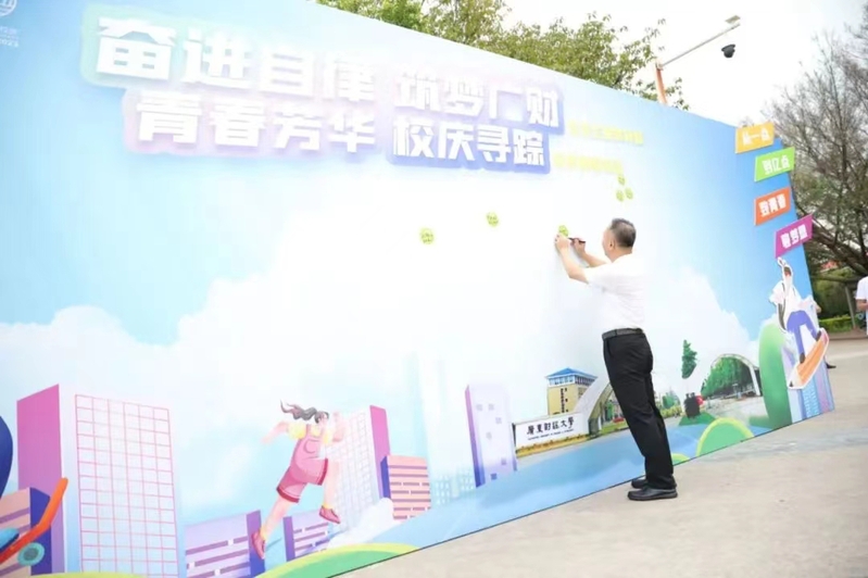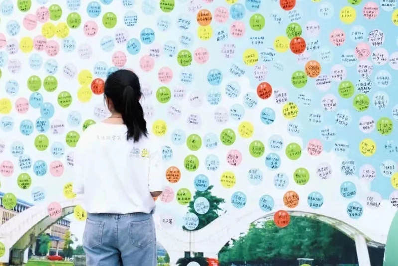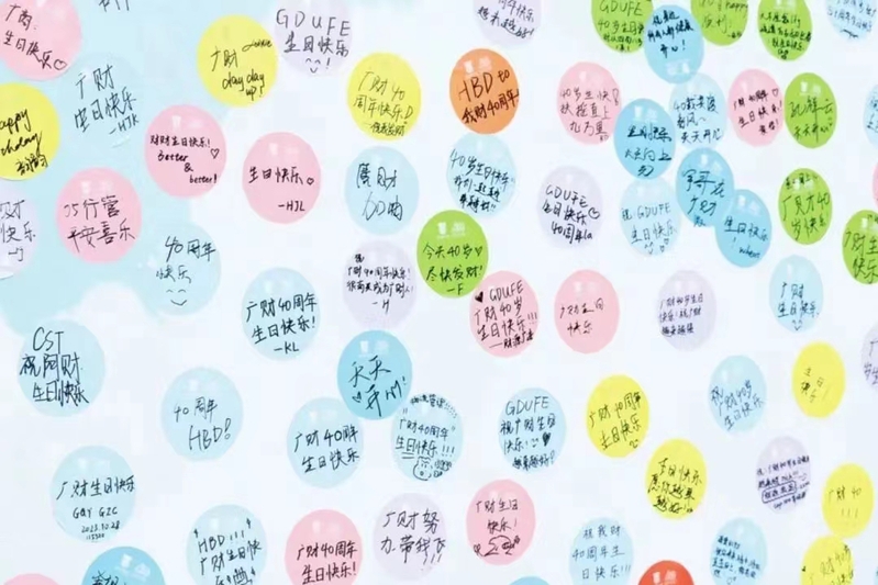 时光流转,岁月更迭,校友们和师生在此相聚,共同执笔。在创意签名墙上,于一撇一捺之间,落下了对青春的致敬,对未来的期望。从“一点”到“亿点”,签名墙上密密麻麻的祝福,生动地诠释着,广财薪火的代代相传,未来的欣欣向荣。