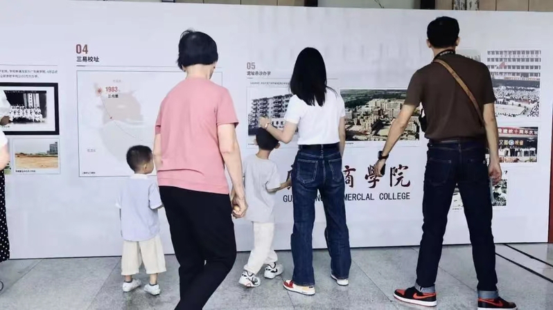 “听到广财今年校庆,我就立马赶回来,带着我的家人重逛母校。” 一位女士正同她的家人一起观看展览内容,她称自己是十一年前从广财毕业的学生。当提到学校的变化时,女士激动地表示食堂、图书馆、宿舍楼和教学楼,包括整个校园的环境都发生了巨大的改变。最后她发出了感慨:现在的广财太美了!