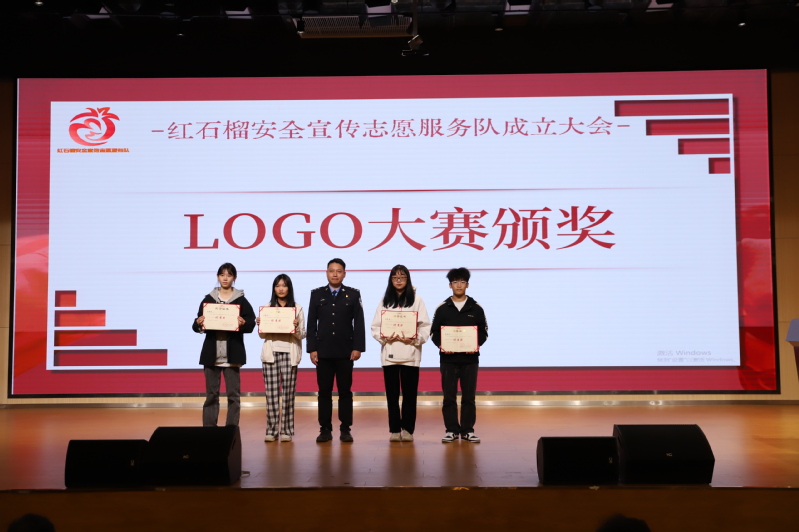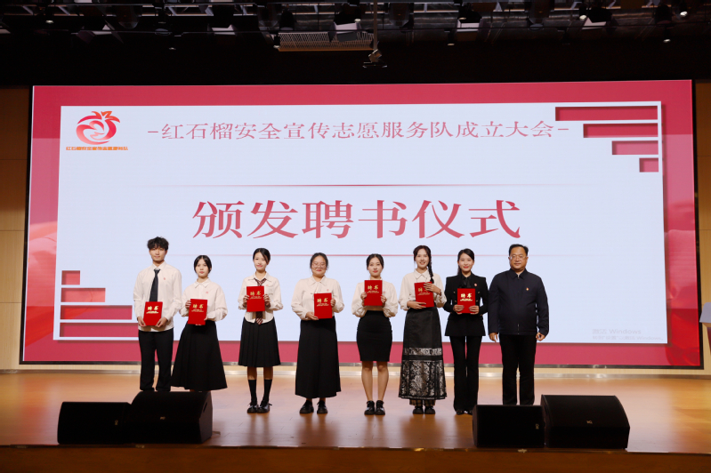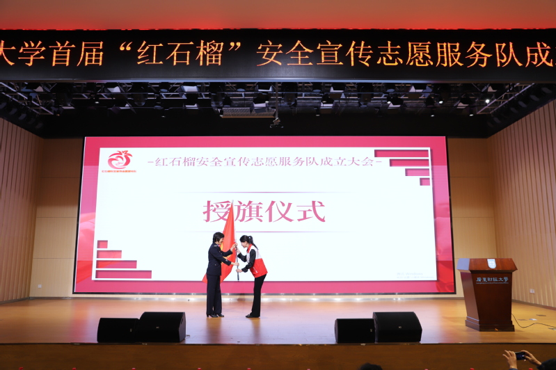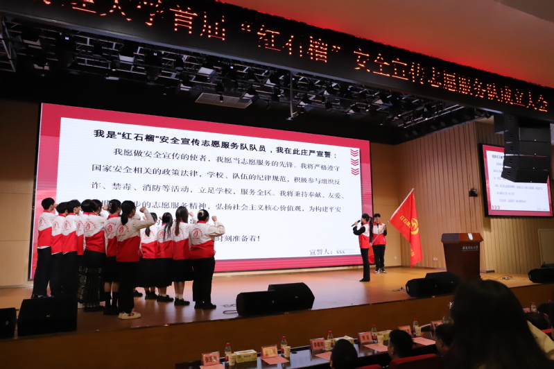 仪式上,翟海殷为队伍授旗,与会领导为红石榴安全宣传志愿服务队干部颁发聘书,为LOGO大赛获奖作品作者颁奖。红石榴安全宣传志愿服务队队长陈钰婷带领全体队员进行宣誓仪式。