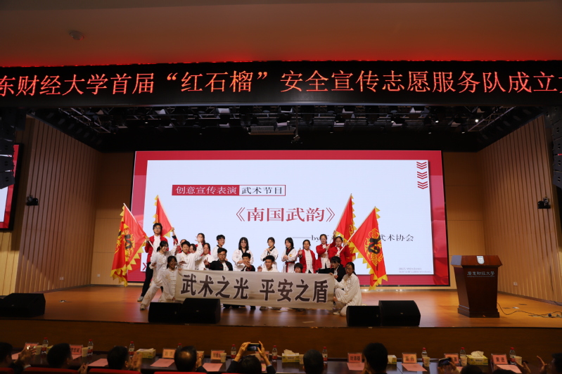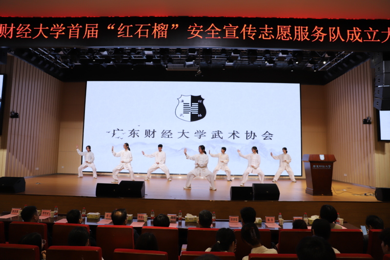成立大会上穿插了精彩的文艺节目表演,学校武术协会带来的《南国武韵》,展现广财学子的精气神和强体魄。学校戏剧团带来戏剧表演《请不要将AI认成TA》,警醒着校区师生提防身边的可疑诈骗行为,坚持“全民防诈,全社会反诈”。学校声乐团带来的合唱表演《飞云之下》,唱出了红石榴安全宣传志愿服务队在飞云之下,向未来起航,为校区安全工作做出更大的贡献的决心。