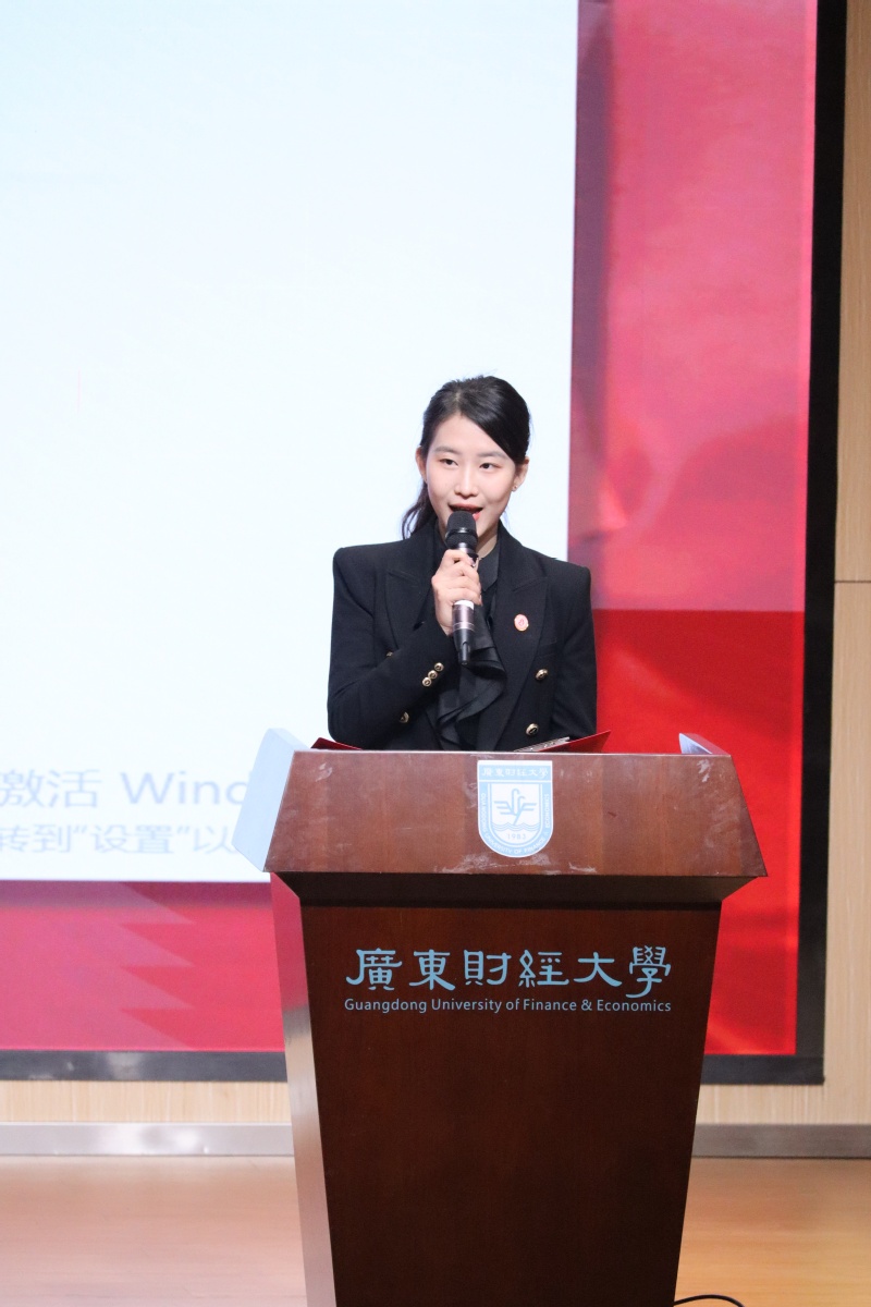 陈钰婷代表志愿服务队作表态发言,她表示,为了进一步强化提升同学们包括反诈在内的各项安全意识和能力,队伍计划开展反诈集市、反诈短视频大赛等多种丰富多彩的活动,并进一步呼吁同学们积极参与,为实现广财的和谐平安做出努力!