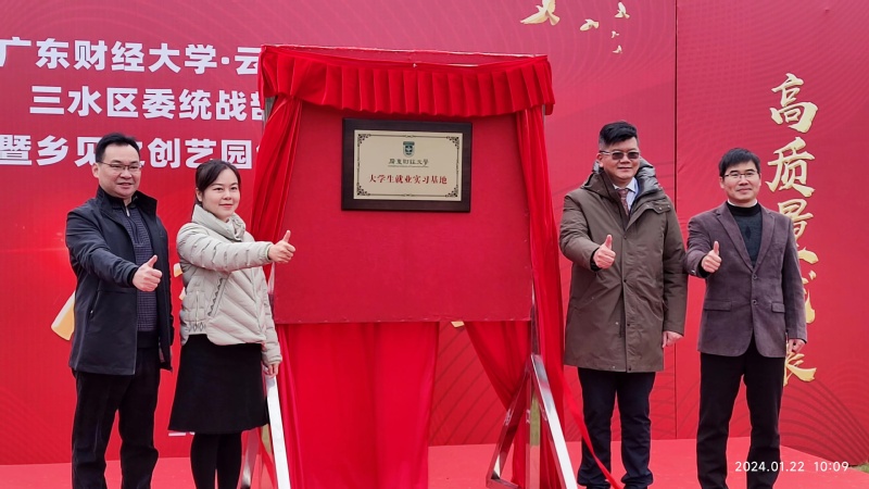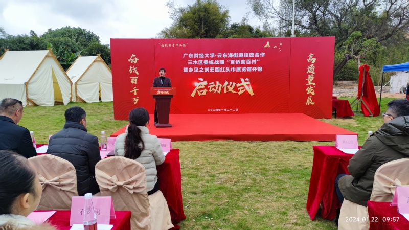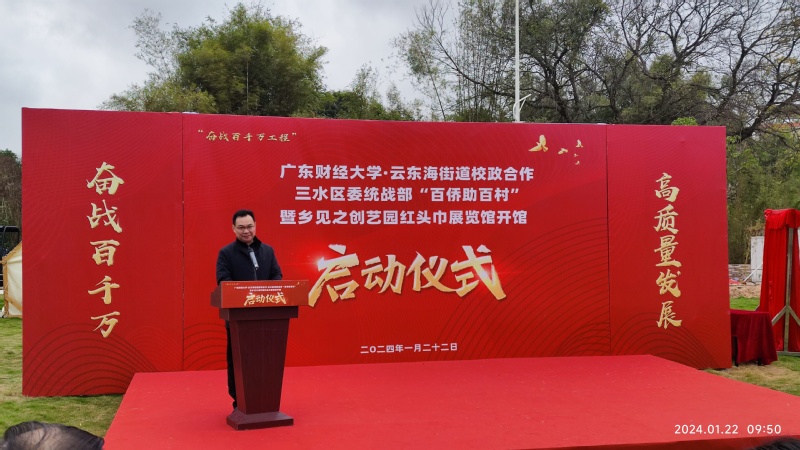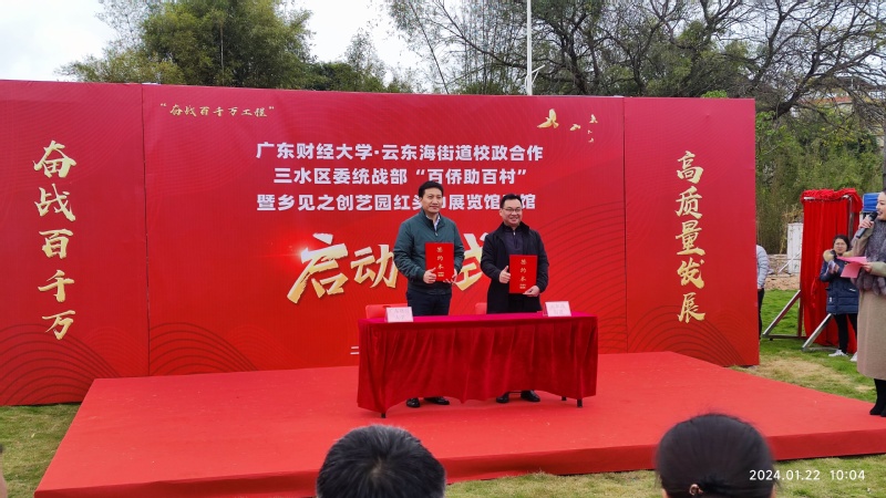 1月22日上午,m88·云东海街道校政合作、三水区委统战部“百侨助百村” 暨乡见之创艺园红头巾展览馆开馆启动仪式在云东海街道乡见之创艺园举行。我校国际商学院院长黄庆安、国际商学院党委副书记郭显军、省市共建办副主任曾忠诚等代表应邀出席活动。当天参加活动的还有三水区委统战部,三水区侨联,三水区云东海街道办,乡见之创艺园等有关单位代表。