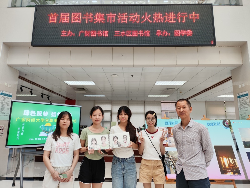此次图书集市活动现场设共有换书摊位、文创摊位、绿色摊位、志愿者招募摊位,以及人物速写摊位五个摊位,活动现场吸引了众多师生参与。换书摊位围着一圈的同学,同学们有的拿着三五本书,有的抱着十几本书,还有的拖着箱子装着三四十本书前来捐赠或兑换。为了增加同学们对佛山文化和三水区地方文化的了解,三水区图书馆提供了《石湾陶》《佛山市三水区革命老区发展史》《恋上淼城》《遇见淼城》《云上东海》等地方文献。文创摊位提供了我校图书馆和三水区图书馆设计制作的文创笔记本、亚麻环保袋、金属书签等文创产品。绿色摊位提供了种子盆栽盲盒、种子卡片和少量水果,目的是宣传绿色环保理念,引导同学们积极参与书籍循环活动,共同建设绿色图书馆。志愿者招募摊位提供了三水区图书馆志愿服务岗位,是同学们走向社会难得的实习锻炼岗位。人气最旺的是人物速写摊位,从活动开始至结束,始终有同学在排队等着。只见老师们一边欢声笑语地与同学们聊天,一边不停地划动着手中的笔,不一会儿,同学们一张张可爱的脸便跃然纸上。