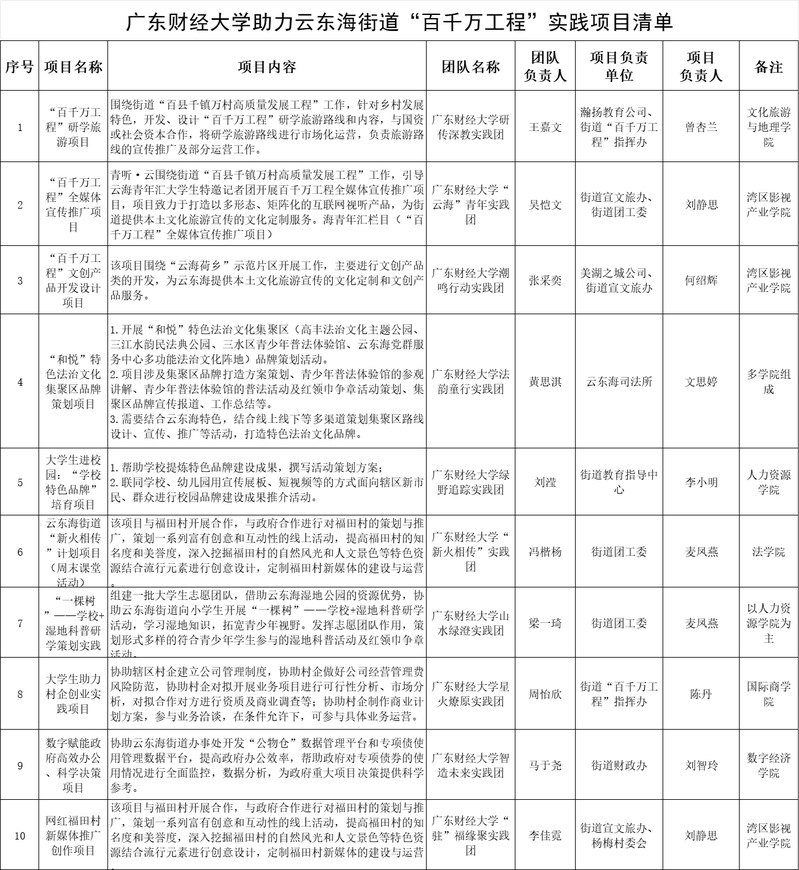 云东海街道方面高度评价了我校学生团队的素质能力,对有关项目取得的阶段性成效也十分认可。前期,云东海街道以项目为抓手,向各村居、各部门征集了与“百千万工程”相关的工作需求,整合成10个需求项目,面向广财大各学院招募项目实践团队,在责任部门、指导老师的带领下,共同完成从方案策划到运作执行,从而实现成果输出。