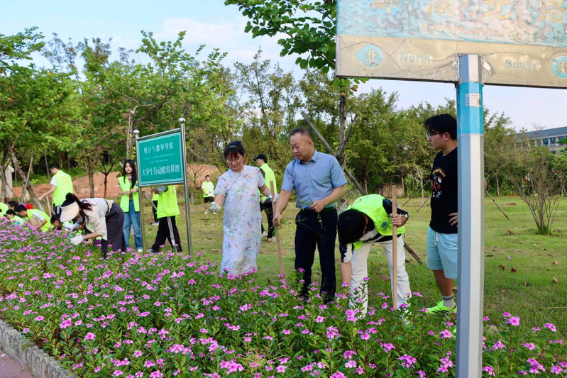 为响应习近平总书记“扩绿兴绿护绿”的号召,提高广大学生的生态文明和劳动意识,共建绿色校园。 10月17日下午,统计与数学学院党委副书记聂华丽、m88团委书记吴春苑、24级辅导员卢秀芬带领23、24级志愿者们在m88统数学院劳动教育基地开展“护绿行动”劳动教育。学校党委常委、m88党委书记王伟莅临现场指导此次活动。